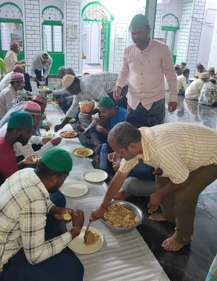 ರೋಜಾ ಇರುವ ಮುಸ್ಲಿಂ ಭಾಂದವರಿಗೆ ಮಸೀದಿಯಲ್ಲಿ ಹಿಂದೂ ಸಮುದಾಯದಿಂದ ಇಫ್ತಾರ್ ಕೂಟ ಆಯೋಜಿಸಲಾಯಿತು. ಮುಸ್ಲಿಂ ಧರ್ಮದ ಪವಿತ್ರ ಹಬ್ಬ ರಂಜಾನ್. ಈ ಸಂದರ್ಭದಲ್ಲಿ ಮುಸ್ಲಿಂ ಸಮುದಾಯದವರು ದಿನವಿಡಿ ಉಪವಾಸ ಆಚರಿಸುತ್ತಾರೆ. ಸಾಯಂಕಾಲ ಉಪವಾಸ ಮುಕ್ತಾಯದ ನಂತರ ಅವರಿಗೆ ಹಿಂದೂ ಧರ್ಮವರು ಇಫ್ತಾರ್ ಕೂಟ ಆಯೋಜನೆ ಮಾಡುವ ಮೂಲಕ ಭಾವೈಕ್ಯತೆ ಮೆರೆದರು.